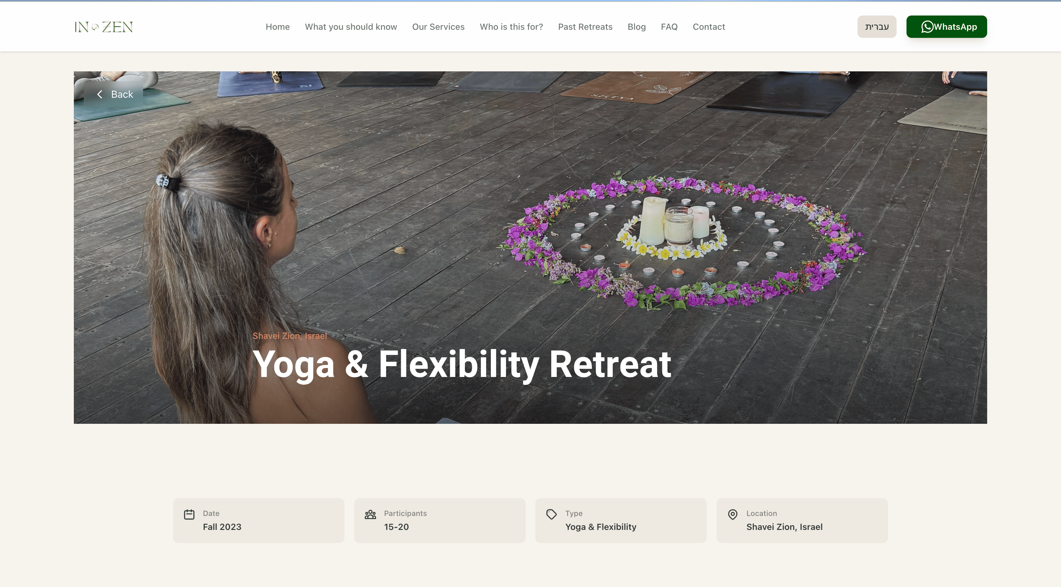 Live site showcasing services, past retreats, testimonials, and WhatsApp/contact CTAs
